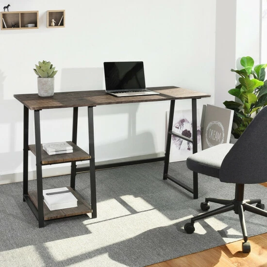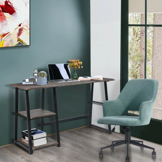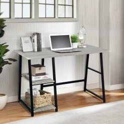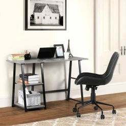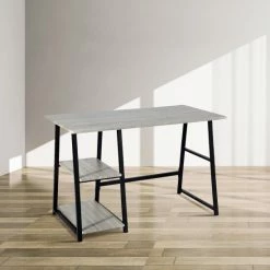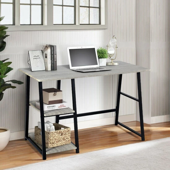 This writing desk is designed for multiple purposes, well fitted in the office for work, study room for study or virtual school, playroom for board games, and living room for family use. Great for apartments or houses in need of a space-saving desk. With a spacious desktop, it’s perfect for your office supplies, laptop or computer, and notebooks. 2 storage shelves underneath the desk keep your books or paperwork, or some baskets handy when needed. The powder-coated metal frame of the A-shaped design provides stability for the home office desk. It complements easily your office or living room furniture with this simple modern style.