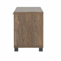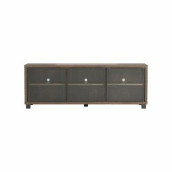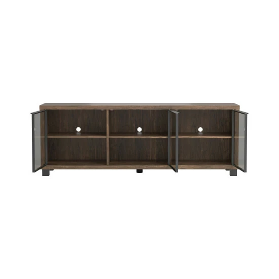 Give your living room a sophisticated upgrade with this beautiful, wooden TV console. This stylish console is equipped with six storage compartments to easily organize your space. An aged walnut finish blends with black metal accents for a classically beautiful look. Natural wood grain designs lend rich, rustic appeal. This transitional TV stand is complete with an expansive surface that fits up to a 64-inch TV.