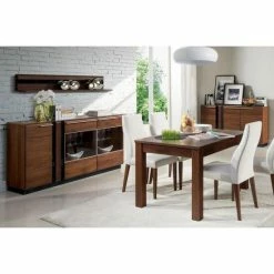 This shelf has been designed to furnish stylish interiors, the structure of quality solid oak wood in the front and in the form of natural veneer on the body has been emphasized with a warm classical antique oak and chocolate oak color scheme. A recurring textured element surrounded by black glass with with a glossy accent makes a declarative motif.