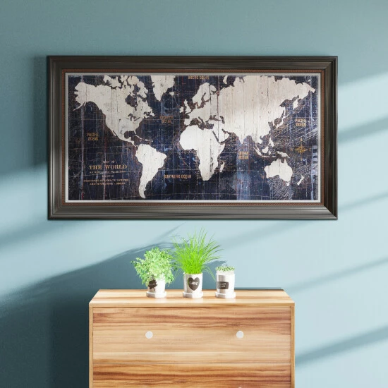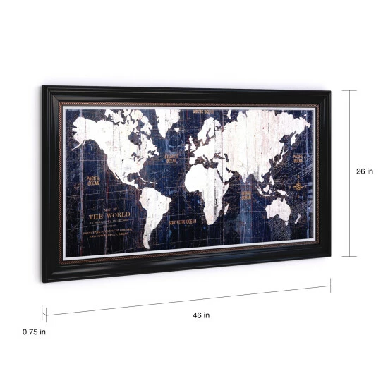 Explore the continents from a vintage viewpoint with this ‘Old World Map Blue’ canvas art. This framed art features a panoramic continental view for an awe-inspiring effect on your wall. Burlap molding adds to the piece’s antiqued look for an attention-demanding presentation from every angle.