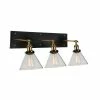 Showcase brilliance when you choose this two-light sconce for your bathroom. Featuring a stunning black and gold-brass finish, this sophisticated lighting fixture exudes a rustic aura. Each incandescent bulb is lovingly ensconced by a conical glass shade, completing this sconce’s breathtaking finish.