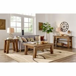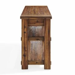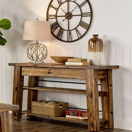 This beautiful console table is a picture-perfect addition to rustic, industrial, or farmhouse home. Made of solid acacia wood, this table features a varied light and dark lacquer finish with natural knots and cracks for an authentic look. Two open lower shelves provide extra display space.