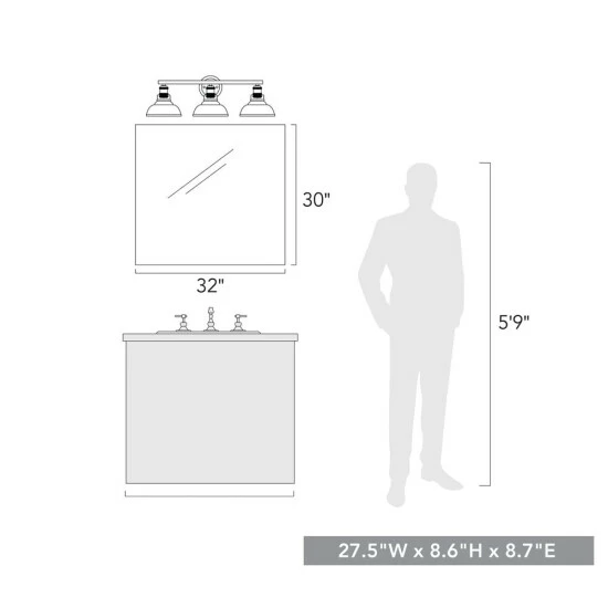 This three-light bath vanity has a cool, industrial design that will be the finishing touch in any bathroom especially those with modern and transitional styles. Available in two finishes, the smooth black finish adds a sleek look to a bathroom with clear glass shades.Β
