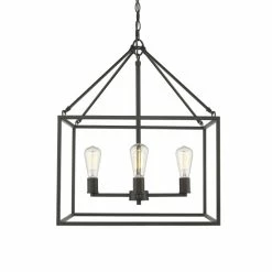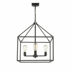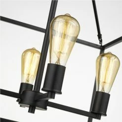 The industrial look is enhanced by the exposed medium-based bulbs inside the square tubing of the open, geometric cages. Complete the modern, rustic look by installing Edison Bulbs. This 4-light chandelier’s generous frame makes it perfect for large open spaces, while its height allows it to work comfortably in 8-9′ ceilings.