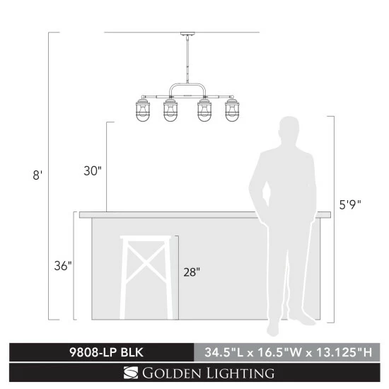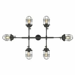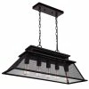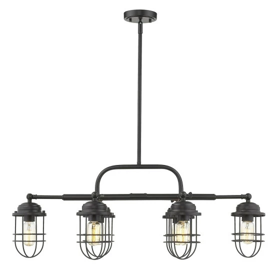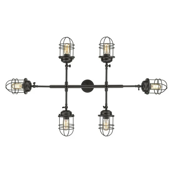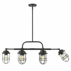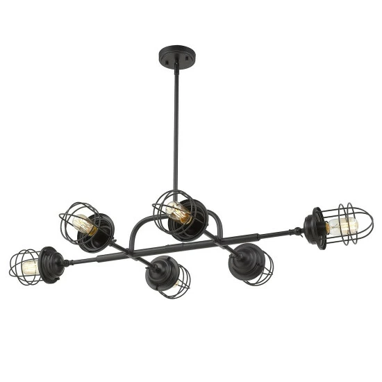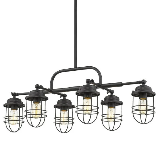 The New England style is enhanced by protective cages that shield the otherwise exposed bulbs. Created to suit the needs of many, swivel canopies allow the fixtures to be mounted on sloped ceilings. Ball joints permit a multitude of configurations. Point all of the metal shades down for directional task lighting or angle them out to fit a low ceiling or tight space. This 6-light linear pendant perfectly illuminates an elongated bar, dining table, or kitchen island.