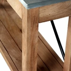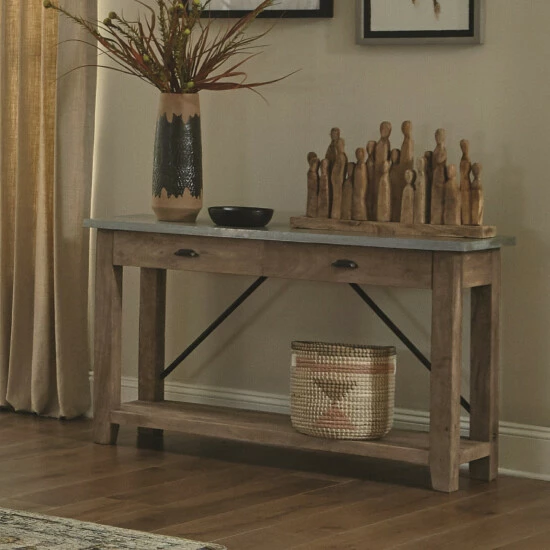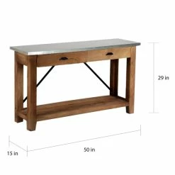 Add extra style and decorative space to your living area with this Blitz console table from Carbon Loft. The attractive table features a sleek, zinc galvanized steel top that contrasts beautifully with the natural beauty of the wooden base. The straight legs and metal rod accents combine perfectly with the planked lower shelf and the two drawers, adding both storage and style to this chic console table.