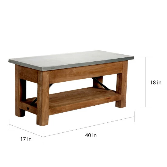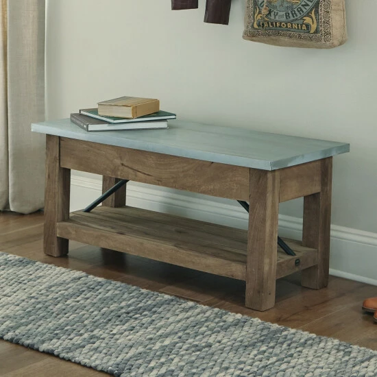 Add a hint of industrial charm to your living space with this Blitz bench from Carbon Loft. Ideal for hallways, mudrooms, and entryways, this stylish bench features a zinc galvanized steel top set over a straight-legged wood base with a matte lacquer finish that allows the beauty of the woodgrain to shine through. A lower plank shelf with metal rod accents provides plenty of storage space for shoes and bags.Β