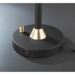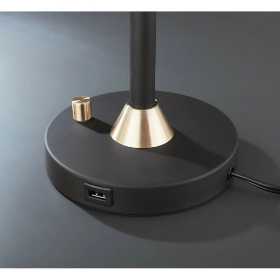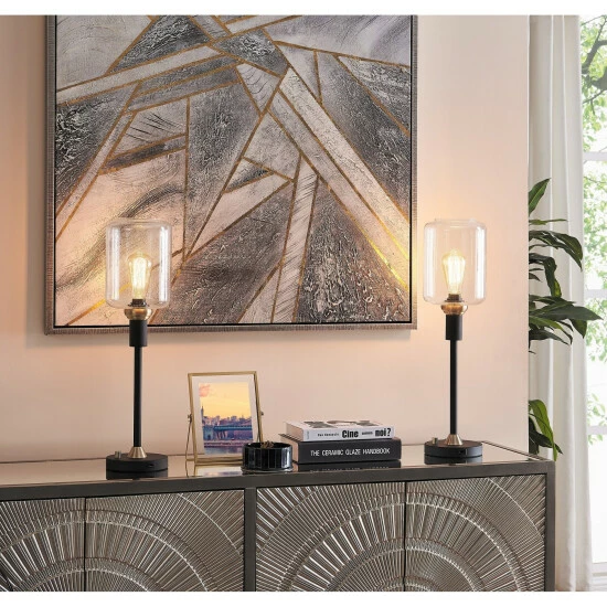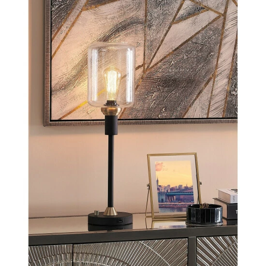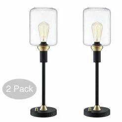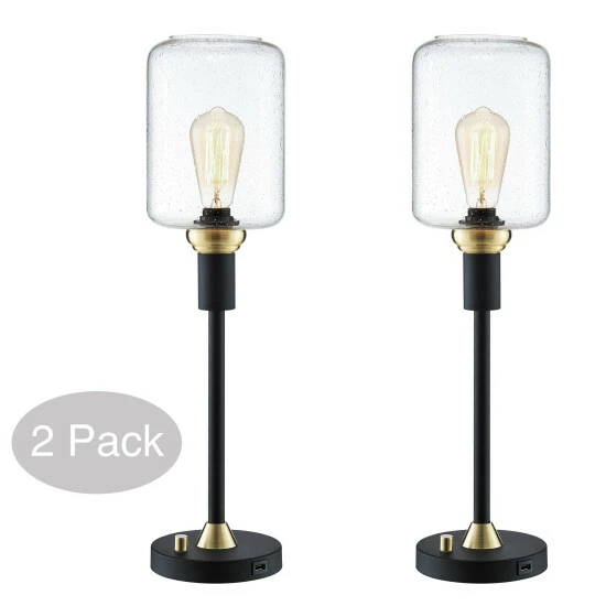 Traditional charm meets contemporary style in this Bohman table lamp set from Carbon Loft. The two, candlestick style lamps are crafted from black metal with antique brass accents, and are topped with cylindrical seeded glass shades that pair perfectly with the included vintage bulbs for a standout look. The round base of each lamp features a USB charging port that adds modern functionality to this beautiful lamp set.