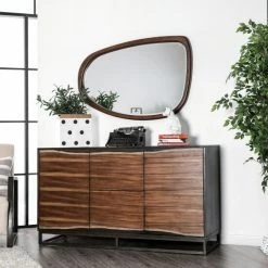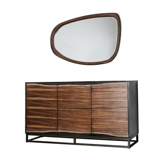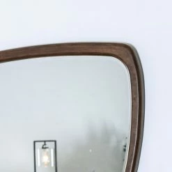 This irregularly shaped wooden accent mirror has a stylish earthy-inspired form that certainly catches the eye. Its dark oak finish and rustic edges make this accent mirror a wonderful focal point for your room.