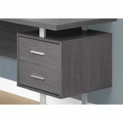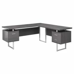 Sleek and contemporary, this extra-long L shaped corner computer desk is the perfect combination of function, durability and design in a modern form. Finished in an elegant grey wood-look on all sides, this workstation with the thick floating tops and sleek u-shaped metal legs adds pizzazz with practicality to any home office. Featuring two large storage drawers and a file drawer to help keep you organized, which can conveniently be assembled on the left or right hand side, with plenty of desktop surface for your all your working needs. This highly functional desk is a must-have for any home business!