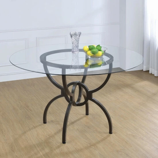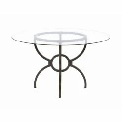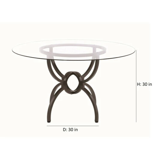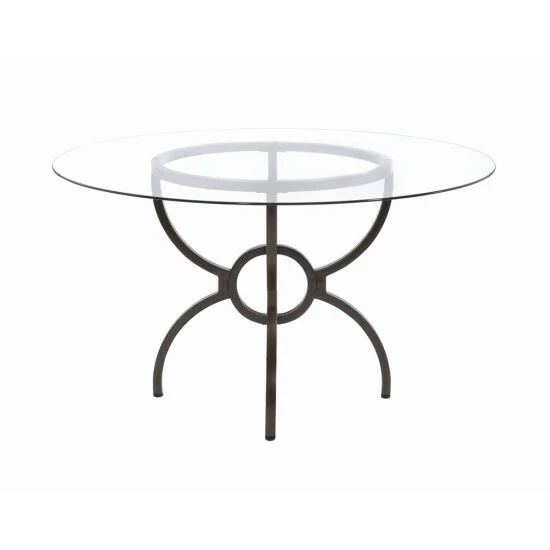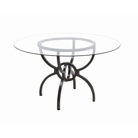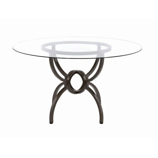 This base shows off metal construction with four stylized legs that meet in an interlocking ring motif. A gunmetal finish lends a rich final touch.