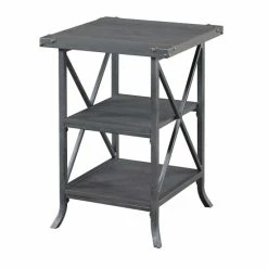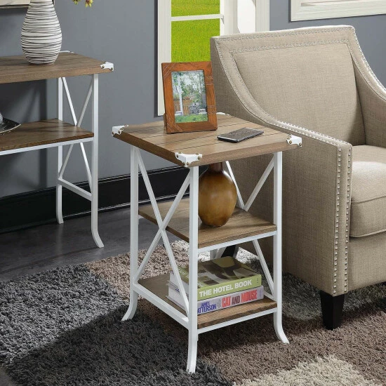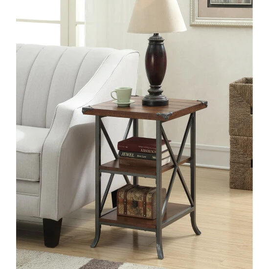 Give your living room some extra convenience while elevating its look with this elegant two-shelf end table. Made with a mix of engineered wood and metal with a two-tone finish, this end table has a distinct, industrial look. The two open lower shelves are perfect for storing books and more.