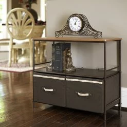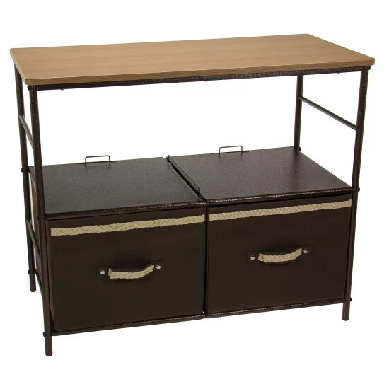 Organize in style with this Bronze Two-Shelf Storage Unit from. Your home or office can instantly enjoy the refinement of warm bronze while benefitting from the quick organization of a handy, easy access, storage facility. This hard-topped storage stand with hammered bronze finish is classically elegant. It is also versatile and adaptableand small enough to be used to be used in tight spaces. It comes with two shelves that can fit side by side as one long shelf or sit separately as two shorter shelves on different levels. Four dark brown bins with rope accents compliment the bronze finish and fill in the remaining space offering a variety of design options to suit your needs. Elegant enough to keep in the foyer or front room, the Bronze Two-Shelf Unit is also practical enough to be used in the family room and in the kitchen. Its conveniently sized bins are useful for tucking away the clutter that accumulates in the living of life. Have stands to organize linens, toiletries and beauty supplies in bathrooms. Or have several in your workspace or craft room to organize projects and supplies for efficiency and painless cleanup. Place another in the rec room to keep everyone’s interests and entertainment handy yet tidy. Even closets get a makeover with this petite unit. Keep one in the office waiting room to organize magazines and entertainment without overwhelming your space. Its classic, natural design looks great wherever it stands. Unit measures 24’h x 28.4’w x 13.6’d.