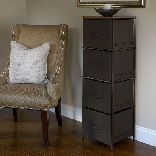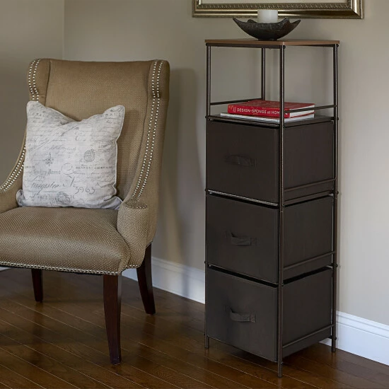 Bring this lovely Bronze Four Shelf Tower to your home or office and instantly enjoy the refinement of warm bronze. This hard-topped storage stand with hammered bronze finish is classically elegant. It is also versatile and adaptable. It comes with two shelves that can fit side by side for a long shelf or sit separately for two shorter shelves on different levels. Four dark brown bins with rope accents compliment the bronze finish and fill in the remaining space, offering a variety of design options to suit your needs. Elegant enough to keep in the foyer or front room, the Bronze Four Shelf Tower is also practical enough to be used in the family room and in the kitchen. The conveniently sized bins are useful for tucking away the clutter that accumulates in the living of life. Keep one in the hallway with a bin for every family member’s things that have migrated into common spaces. Have stands to organize linens, toiletries and beauty supplies in bathrooms. Or have several in your workspace or craft room to organize projects and supplies for efficiency and painless cleanup. The removable bins slide easily out of their place for a day’s work and slide back in just as easily at day’s end. Place another in the rec room to keep everyone’s interests and entertainment handy yet tidy. Even closets can get an overhaul with this tower. Keep one in the office to organize supplies and keep them handy without showing stacks of sticky notes and highlighters. Its classic, natural design looks great wherever it stands, making it organization that is simple and to use and attractive, too. Unit measures: 48’h x 14.85’w x 13.6’d.