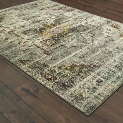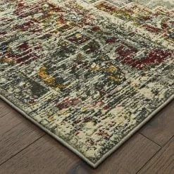 The area rug showcases warm shades of gray with highlights of bright gold, vibrant red, blush and cool blues in global traditional styling. Machine-woven of polypropylene and polyester, it utilizes both matte and lustrous yarns for added visual texture to compliment your space.