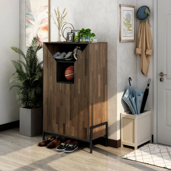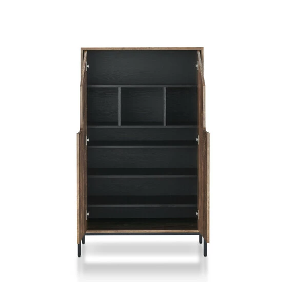 Complement your color scheme with this 53 inch high shoe cabinet by Carbon Loft. The fitted cut-out cabinet doors lend style and conceal three storage cubbies and four shelves for your toys and footwear. Wood construction is supported by a 4 metal leg base. Bright exterior and dark interior provides contrast with a quick access cut-out. Made from MDF and veneer, this sturdy unit offers value for storage and saves space in the garage or front door.