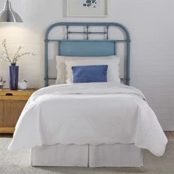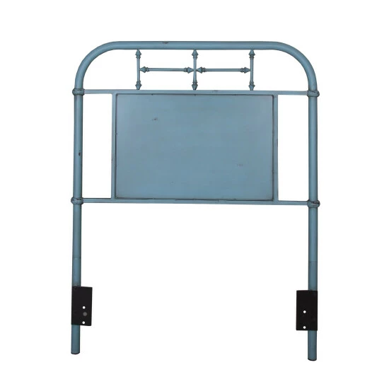 Add a unique look to your home with the Vintage Series Twin Metal Headboard. Crafted of metal tube and finished in a beautiful robin’s egg blue with wear thru. The headboard features a softly shaped cap rail and turned metal spindles highlighting a center panel. The Vintage Series headboard will work with a metal bed frame making it perfect in small spaces and any decor from cottage to farmhouse.
