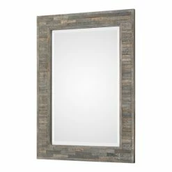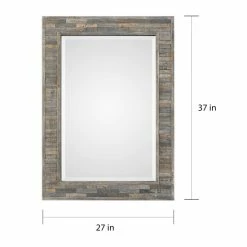Offer a rustic touch to your space with this charming mirror. Strips of weathered pine finished in a heavily distressed charcoal blue create a farmhouse look perfect for lending life to any area.