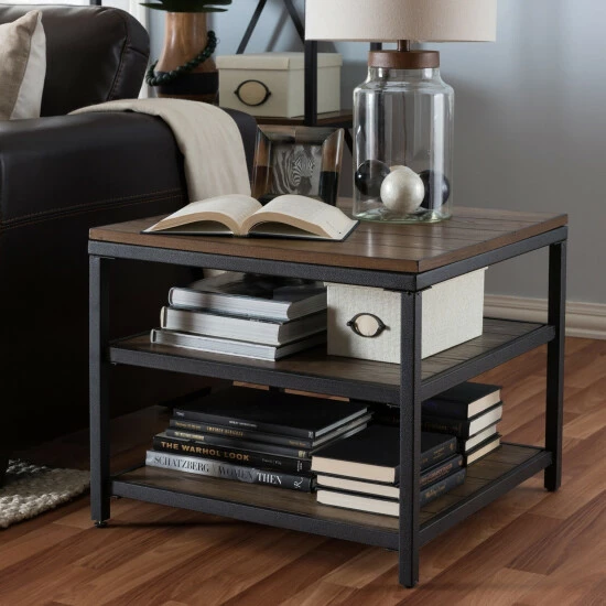 Enjoy the industrial chic design and generous storage provided with this versatile end table from Carbon Loft. With a bronze iron metal frame paired with a distressed ash veneer wood top, this end table gives off rustic, aged vintage vibes. The two large shelves below the top of this end table add valuable storage space to your living room.
