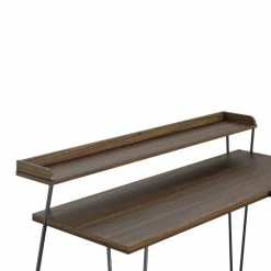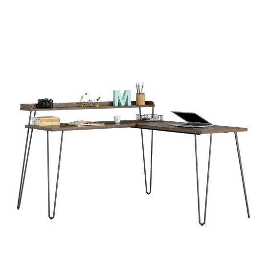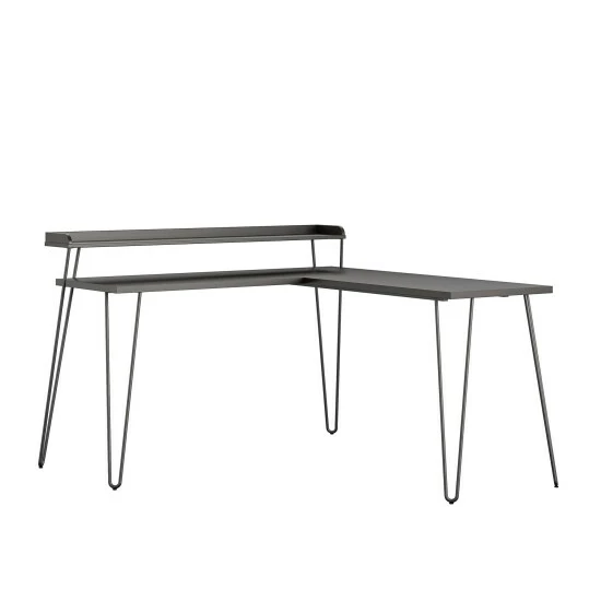 Mix industrial and modern styles together to get this L Desk with Riser. This Desk is perfect for both large and small home offices with its small foot print and offers 2 levels of desk space with the added riser. The L-shape makes it easy to place the Desk either in the corner or middle of the room to define your space as needed. The finish coordinates with almost any decor, while the laminated particleboard desktop and powder-coated metal legs give this Desk a sturdy build along with a fun design. The desk top is large enough to hold your laptop, notebooks, and office essentials while the riser can be used to keep items close by but out of your way. The metal hairpin legs are a fun throwback to popular mid-century design. The L Desk with Riser ships flat to your door and requires assembly upon delivery. Two adults are recommended for proper assembly. The Desk can hold up to 80 lbs.
