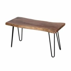 Introduce rustic, industrial glamour to your space with this distinctive and artful bench. The natural acacia wood bench sits atop hairpin metal legs for a sturdy place to sit or put on your shoes. Knots, and the natural wood grain underneath a clear finish gives distinct character to this merging of industrial and mid-century style.