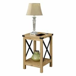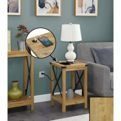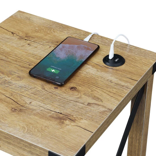 Add functionality to your industrial styled home with the Carbon Loft Dahlonega End Table with Charging Station with Shelf. Featuring a built-in charging station on the tabletop surface for easy accessibility. The charging station includes two USB ports which can easily charge your phone or tablet. The versatility of the exposed built-in station allows for multiple devices to sit on the tabletop without the damaging or twisting of cords. The power supply cord is 6 feet in length giving you the room you need to display your end table where you choose. Includes a bottom shelf great for books; display; or additional storage. Engineered from particleboard and powder-coated metal; this piece is built to last.
