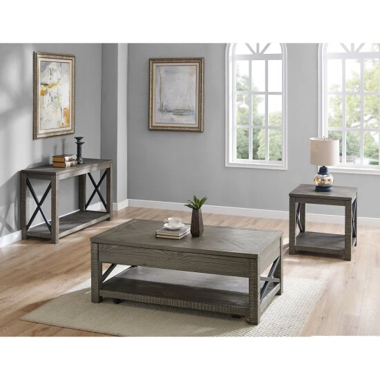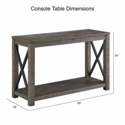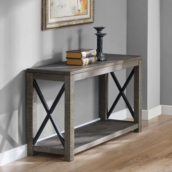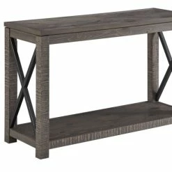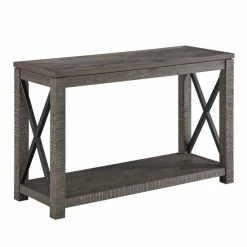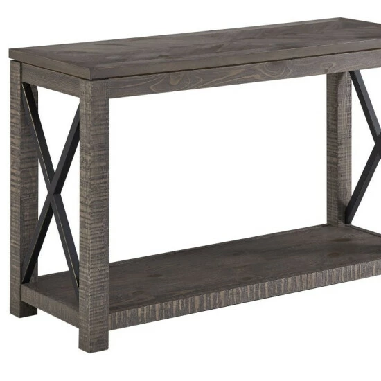 The perfect accent for your rustic retreat, this sofa table is finished in distressed driftwood, with heavy rasping and distressing details on the post style legs and frame. A double top design and stylish metal X-motif accent on each side of the table adds to the rustic style. Β A spacious lower shelf is great for display or use for storage. Perfect for use in an entryway, behind a sofa or as a console table. Your purchase includes one (1) sofa table.