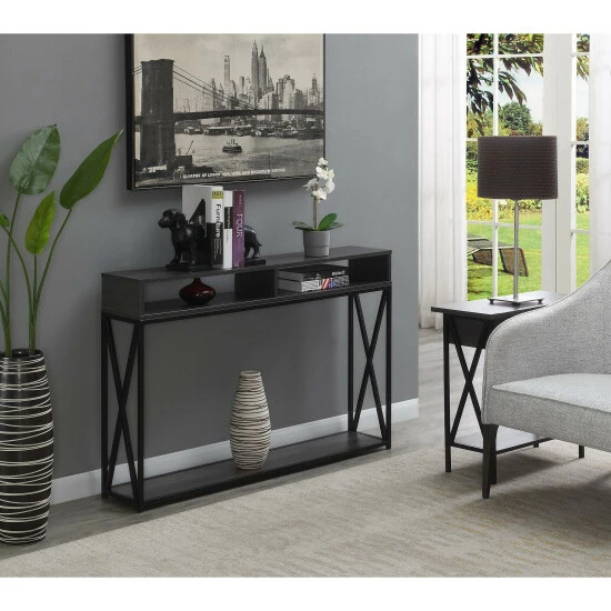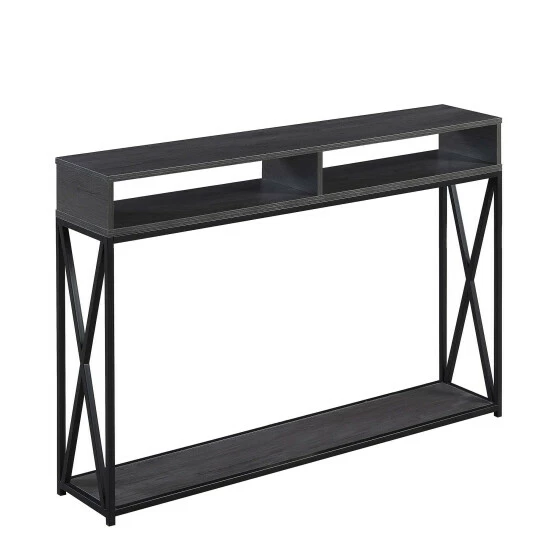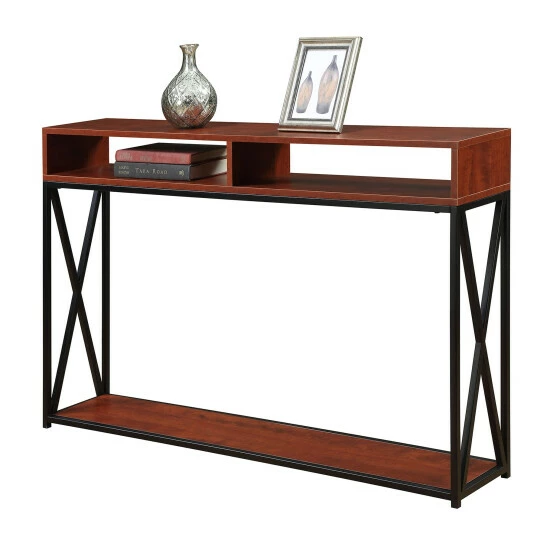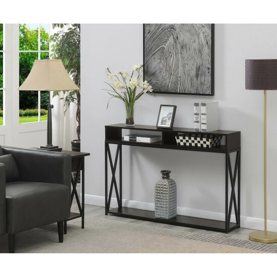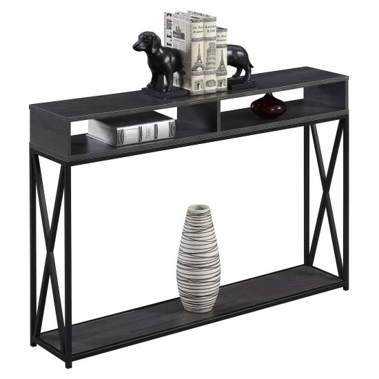 Sleek and modern, this 2-tier console table will make the perfect addition to your space. The narrow table is crafted from MDF with melamine veneers, available in a variety of colors, with two storage compartments that are perfect for stowing books and decor. The sturdy, powder-coated metal frame is embellished with open, X-shaped designs on the sides for a striking, contemporary look.