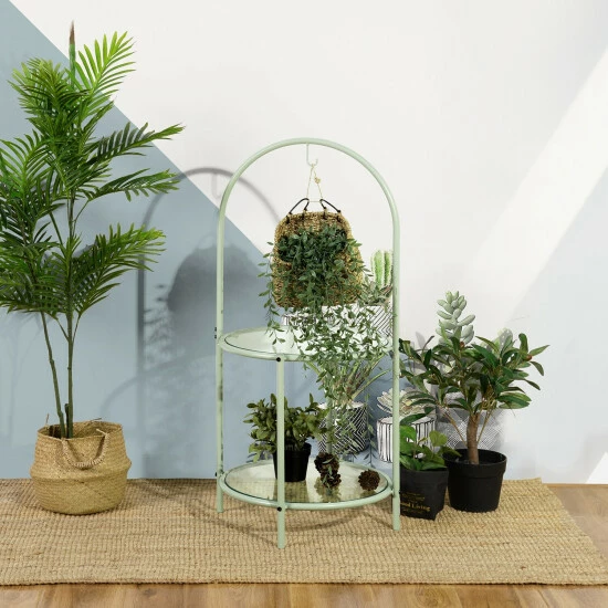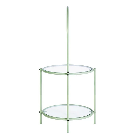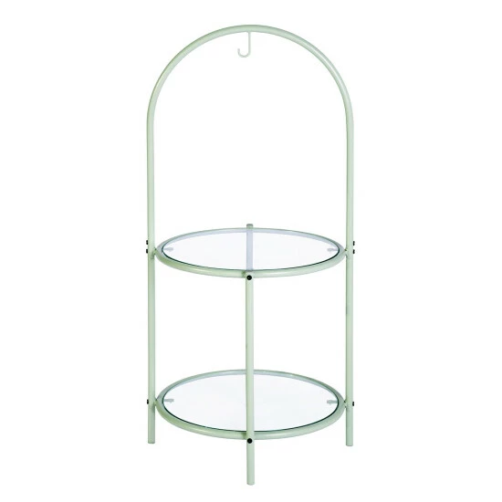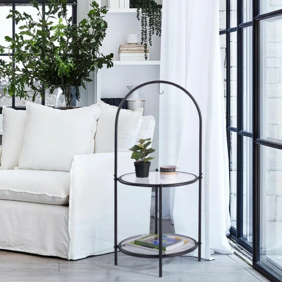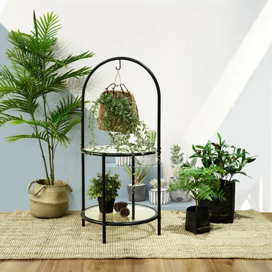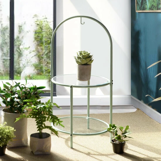 Modern pizzazz meets old world refinement in this lovely and chic console table. Round iron frame welding 4 ear pieces and suction cup to absorb the glass. Top punching lock hook is made for hanging flower basket. The sleek, gentle lines are perfect for decorating hallways and bar areas, and the glass shelves ensure a perfect party or delightful decor options. Β