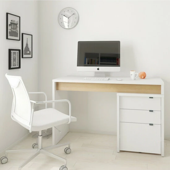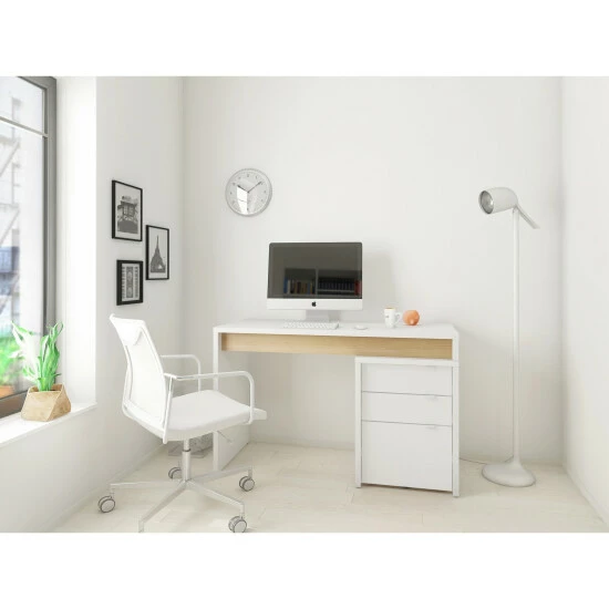 Embrace sleek lines and crisp white color with this office set sporting a natural woodgrain. This versatile piece features a reversible design to suit your home office setup.