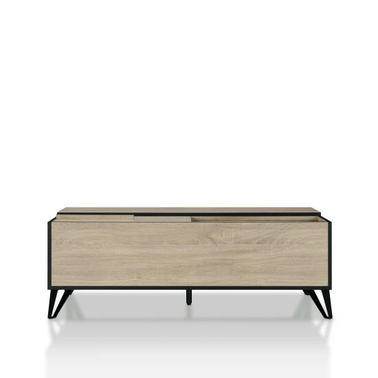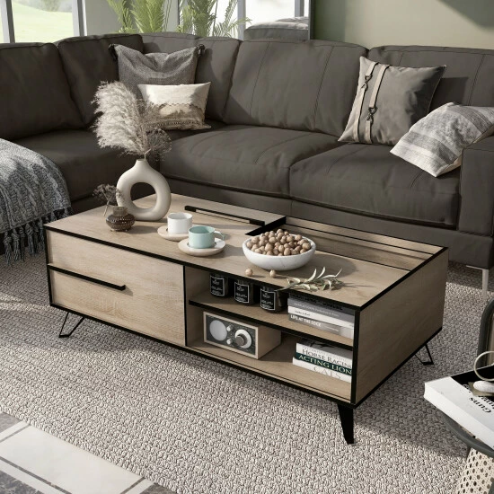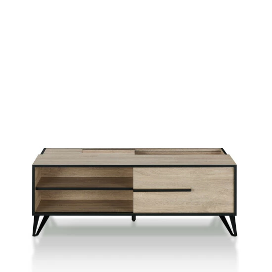 The edgy, urban Mid-century Modern style of this coffee table is easy to see with its simple silhouette and hairpin legs. The recessed sections of the coffee tabletop give you the best of both worlds, partially hidden storage with easy access. Simply slide the partial cabinet door to access items in the side storage shelf or within the coffee tabletop.