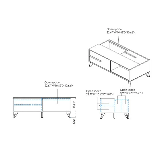 - Larger open shelf: 10.62 inches high x 22.67 inches long x 10.62 inches wide