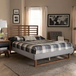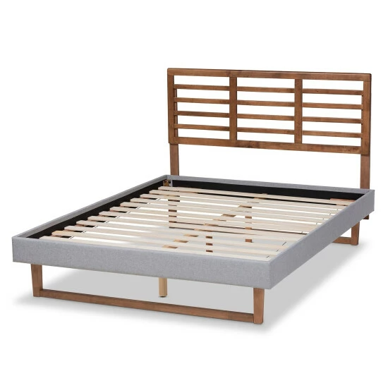 Add a mod look to your decor with this Fennello platform bed from Carbon Loft. The stylish bed features a platform base with slat supports that eliminate the need for a box spring, and grey upholstered side rails. The wooden frame legs and slatted rail headboard in an ash walnut finish add an open, airy feel to this stylish bed.
