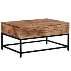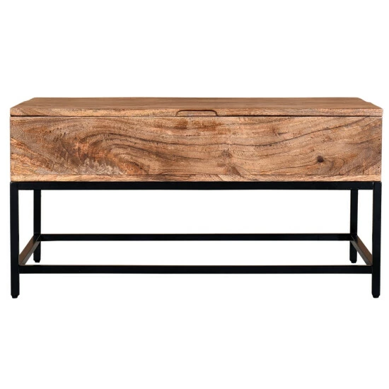 Functional and fashionable, this Fingerling coffee table from Carbon Loft will add a touch of rustic style to your decor. The coffee table is crafted from solid mango wood with a natural burnt finish that reveals the beauty of the woodgrain, and an open, black metal base. The storage table has a slatted top, split so that one side lifts up to reveal a storage space inside, ideal for holding extra blankets, remotes, or board games.