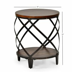 Round out your contemporary or industrial decor with this Carbon Loft Fischer end table. The heavily distressed solid-wood top and lower shelf provide a strong structure for displaying decorative items, and the curving iron frame with rivets adds to the overall design and stability.