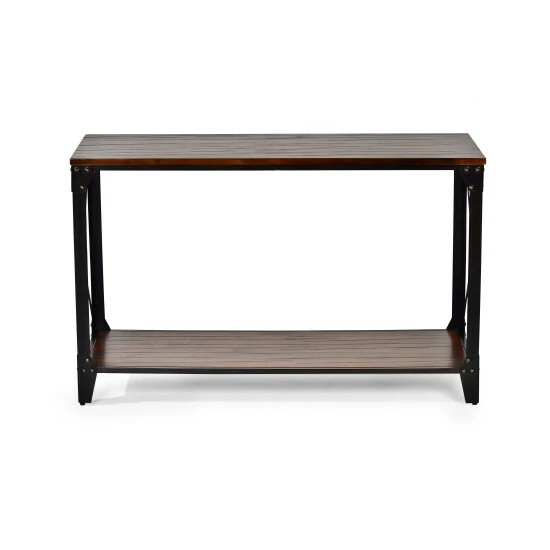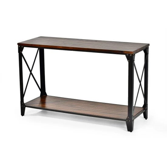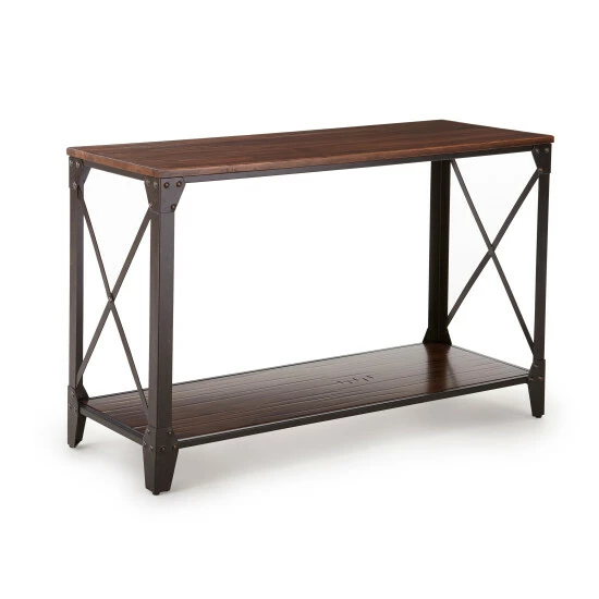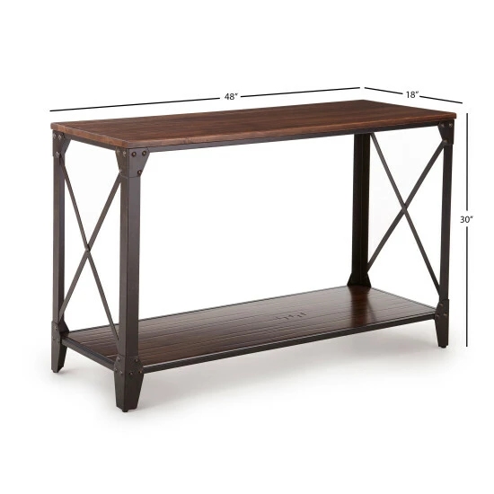 Display favorite decor with this elegant and chic wood and iron sofa table. Crafted with a metal frame featuring industrial-inspired accents like ‘X’ stretcher details and exposed nailheads, this sofa table is topped with heavily distressed birch wood and includes a lower shelf for added space.