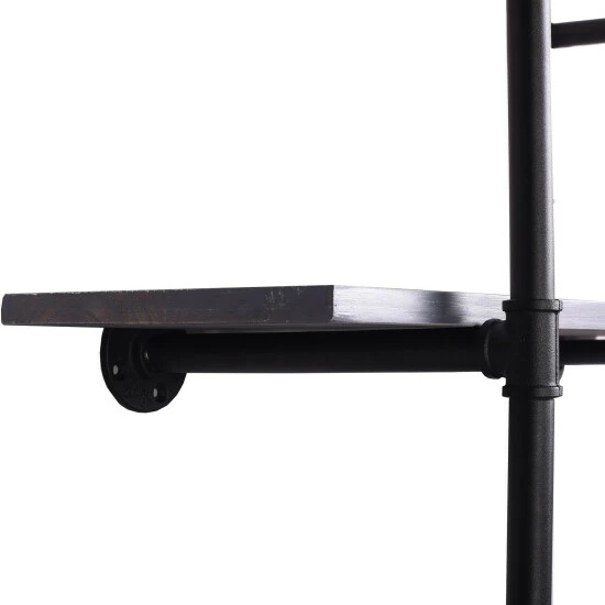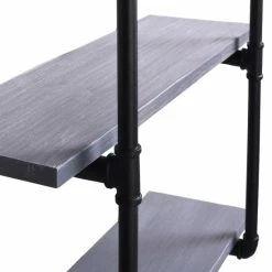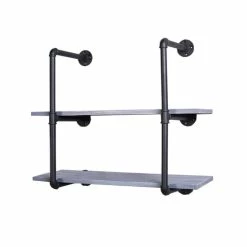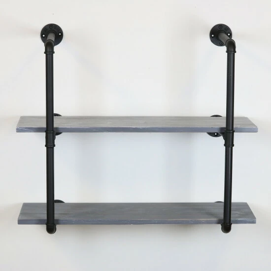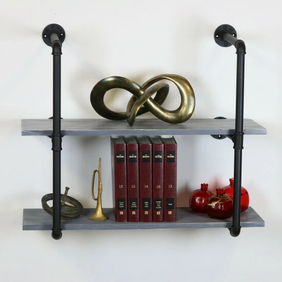 With a bold design utilizing heavy duty black pipes and a grey weathered stained finish, this two-level bookcase infuses your home with alluring industrial style. The floating style saves space in your home while lending an attractive way to showcase books, photographs, and treasures of all kinds.