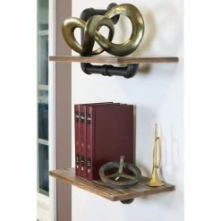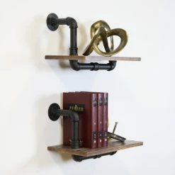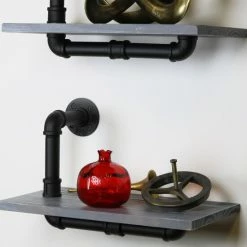 Display any number of decor items, photographs, and treasures on this pair of floating wall shelves. The unique black metal piping provides a delightful touch of industrial flair sure to bump up the charm in your space wherever you place this set of shelves.