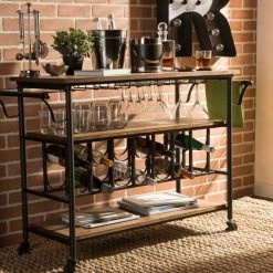 This wood and metal rolling cart has that vintage feel you crave, with two open shelves for extra storage. Hanging glass racks are built in for easy maintenance, while built-in wine racks provide space for wine bottle storage. Flaunting handy towel holders on both sides, it’s mounted on wheels with locking brakes.