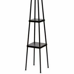Beautifully illuminate any room in your home, studio, or office with this handsome floor lamp. Constructed with a metal frame and a white linen shade, the lamp is finished in a distressed iron color for rustic charm. The lamp also features two shelves suspended between the legs, allowing you to display house plants, picture frames, or other decor pieces in its body. The light is operated by a rotary switch with high, medium, and low light settings.