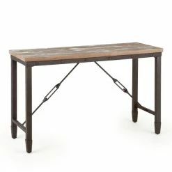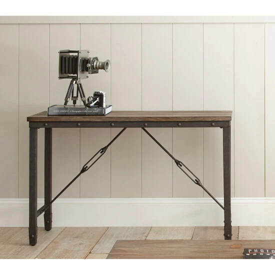 The industrial Carbon Loft sofa table will bring chic, urban style to your living area. The iron base is accented by unique stretchers and exposed rivets, while the wood plank style top is finished in a medium pine for added character.