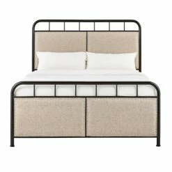 - Upholstered beige fabric panels on head and footboards
