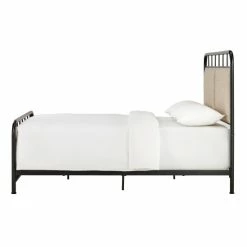 Vintage charm meets sleek refinement in this bold and graceful bed. Fabric upholstered panels make up the head and foot board for a cozy and welcoming touch, and the bed frame boasts retro details for some wonderful personality.