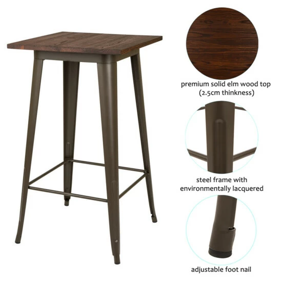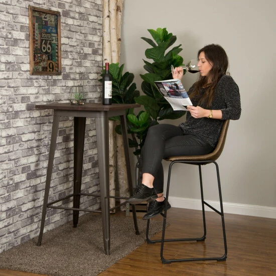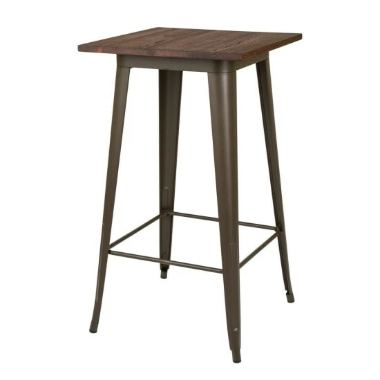 Modernize your kitchen or bar decor with the vintage-inspired style of this bar table. With a sturdy metal base and square-shaped wood top, this two-person table embodies industrial elegance with its distressed finish brown base and walnut top.