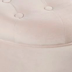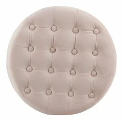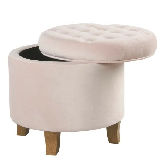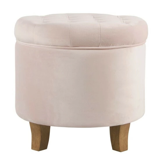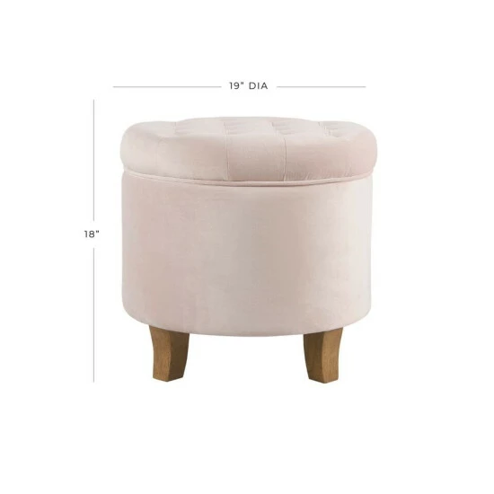 This velvet tufted round ottoman features a lift-off lid with all over button tufting for classic style. Upholstered in soft and durable velvet, this elegant round ottoman has solid wood legs in a complementary finish. Use it to hide accessories in a bedroom, to store books or magazines in a living room, or to keep controllers or remotes nearby but out of sight in a family room. Pair two storage ottomans together for added impact. The tufted ottoman is available in 10 rich velvet colors with coordinating accent items in the same hue.Β