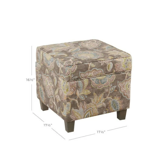 Add a touch of convenience and comfort to your living space with this Hadanberg storage ottoman. The square ottoman features a padded lift-off lid that reveals a storage space, perfect for stowing anything from extra pillows and blankets to toys and controllers. The ottoman is upholstered in soft grey fabric with a floral pattern that is accented with blue and green for a traditional touch.