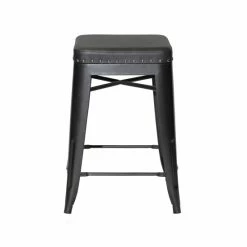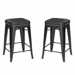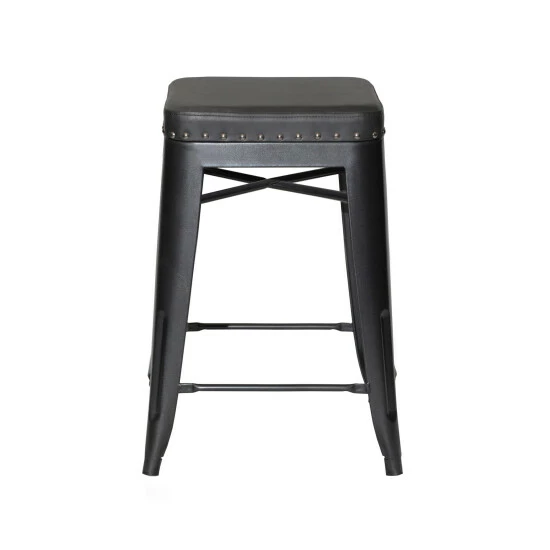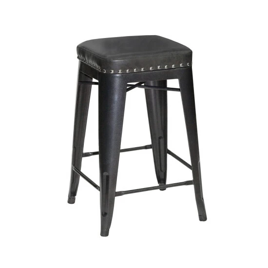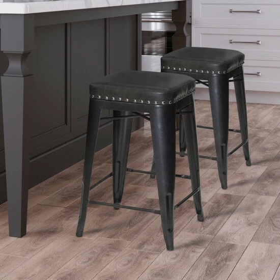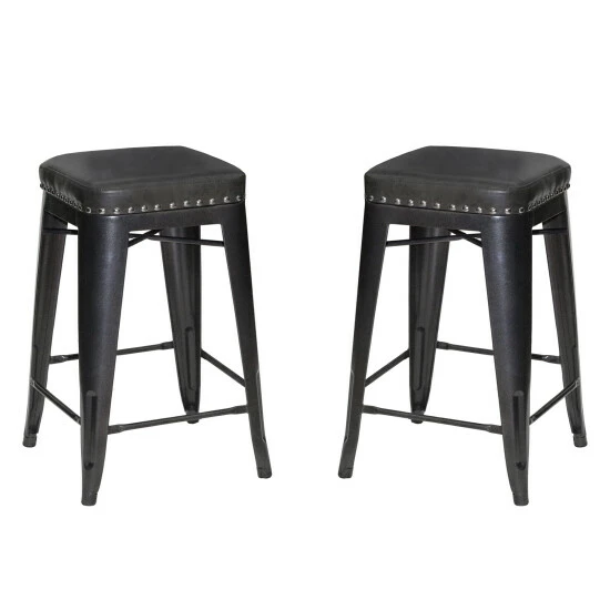 Whether your style is industrial, farmhouse or transitional, the Halstead backless counter stool will fit perfectly into your design. A sleek style in a compact design is the hallmark of the Halstead stools. A fully welded steel frame assures a sturdy, durable stool that requires no assembly. For comfort, the seat is upholstered in granite faux leather which makes this stool comfortable as well as stylish. The nickel nail head trim is the added touch that sets this stool apart. Halstead stools are easy to care for from the graphite faux leather seats (just wipe clean with a damp cloth) to the scratch resistant powder-coated metal finish. A metal footrest helps with comfortable seating as well as adding additional strength to the frame. Nylon floor protectors help to protect any floor surface. This stool will stand up to the test of time and offer a relaxed comfortable seating wherever you place it in your home. Your purchase includes two counter height stools.