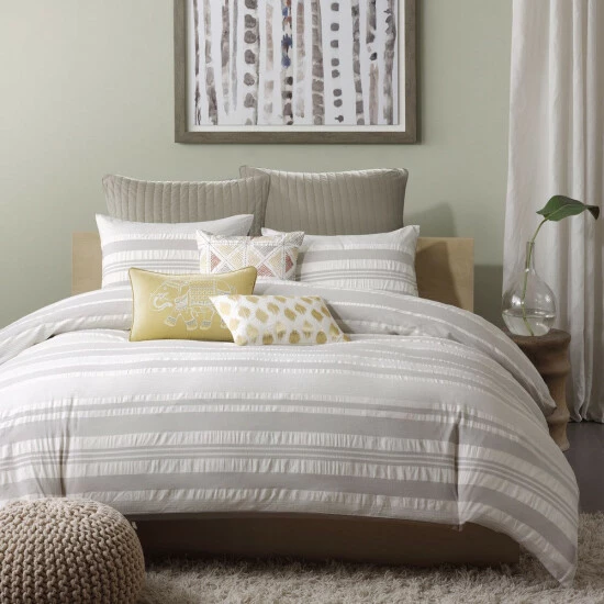 Set up a serene look in your bedroom with this simple and sophisticated comforter set. This grey comforter set offers a striking striped pattern and plush polyester-filled bedspread that combines comfort with style. With its soft cotton fabric, this machine-washable set makes laundering easy. A pair of pillow shams complete this set for an elevated look.