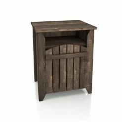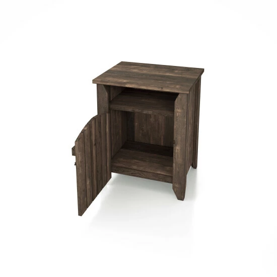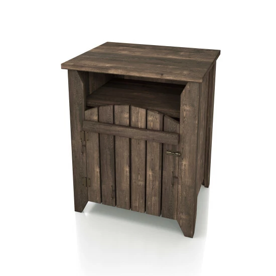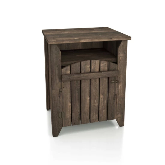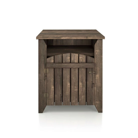 Utterly charming and wonderfully unique, this little end table is sure to catch the eye while offering a space to tuck away necessities. The design is inspired by a front gate, lending a touch of farmhouse flair perfect for enriching decor. Behind the door are two shelves for organization and just a hint of display in the window cutout below the top.