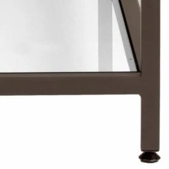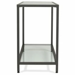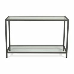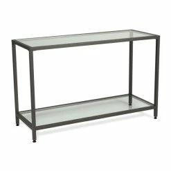 With a beautiful pewter-tone finish and open design, this Heimlich console table from Carbon Loft will give your entryway a shot of sophisticated style. The tabletop and lower shelf are made of beveled tempered glass that rests on a powder-coated iron frame.